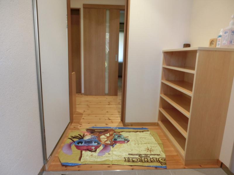 入口左の壁に「Qの家」と書かれた表札があり、そのお国は大きな3枚開きの玄関扉がある入り口付近の写真