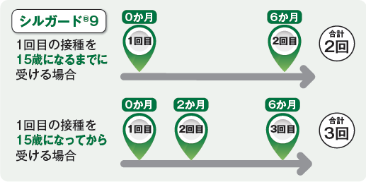 (全2回) 1回目から5か月以上の間隔を置いて2回目 (標準的には0、6か月後に2回接種)- (注意)2回目を接種する時点で15歳を超えていても、1回目が14歳であれば全2回の接種となります。