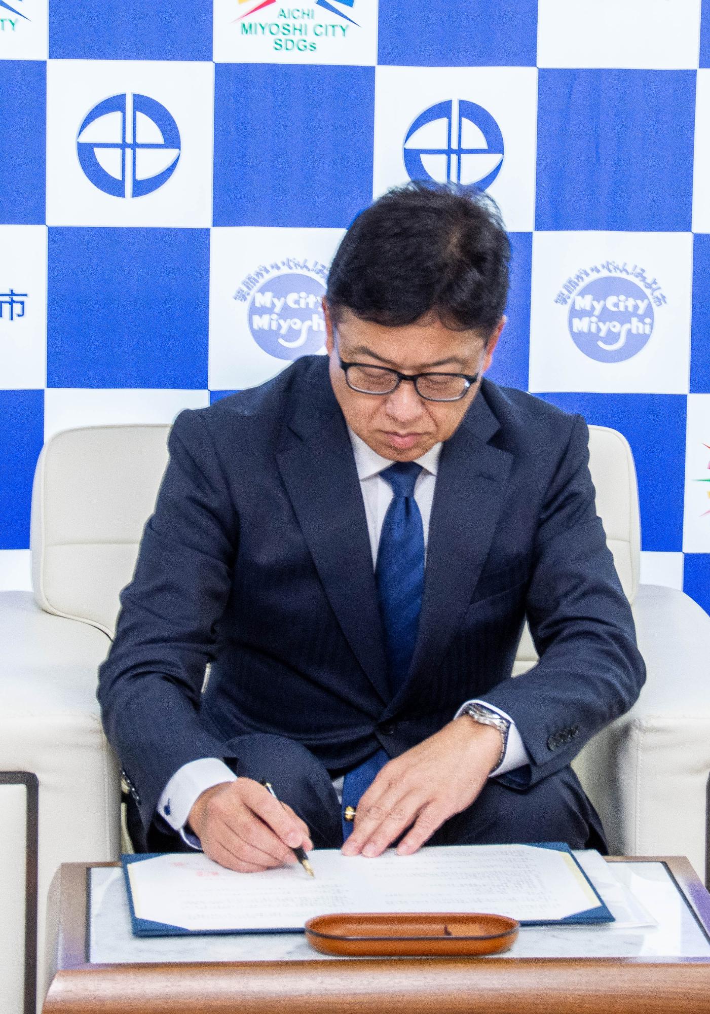 10月20日、イオン株式会社と本市とのまちづくりに関する包括連携協定締結式が行われ、イオンリテール株式会社中部カンパニーの石河康明(いわかわ・やすあき)支社長と小山祐(おやま・たすく)市長が協定書に署名しました。この協定はお互いが連携することで、それぞれの資源を有効活用した協働を推進し、持続可能なまちづくりの実現を目指すもの。式では始めに小山市長が「イベントの開催や児童・生徒による作品展示など、日頃からのご支援・ご協力に心より感謝申し上げます。 今後も本市の活性化にお力添えいただけますよう、お願いします」とあいさつ。石河支社長は「2000年10月に開業したイオン三好ショッピングセンターは、今年で25周年を迎えました。今後も、みよし市の活性化や地域の皆さまへのサービス向上に努め、地域課題のさまざまな解決に向けた取り組みを推進してまいります」と話していました。