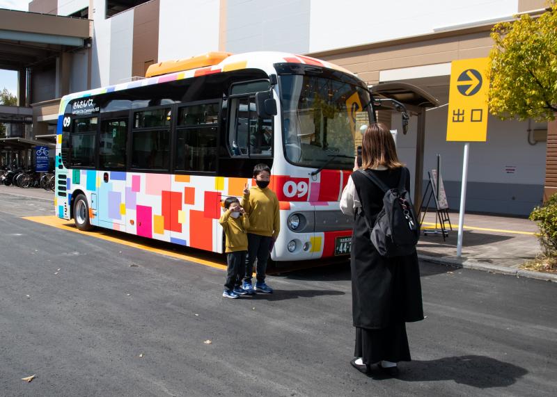 さんさんバスの4月からの新しい路線・ダイヤ・デザインでの運行に向け、3月27日、イオン三好アイ・モールでさんさんバスの周知および利用促進を目的に啓発イベントが行われました。会場には新デザインの車両が展示され、バス乗車体験や写真撮影、啓発グッズの配布などを実施。この日は、市内小学生92人の音声を収録した車内アナウンスが初めて披露されました。収録に参加した小学生とその家族はアナウンスを聞いて「自分の声だ」「上手に話せているね」と喜んでいました。