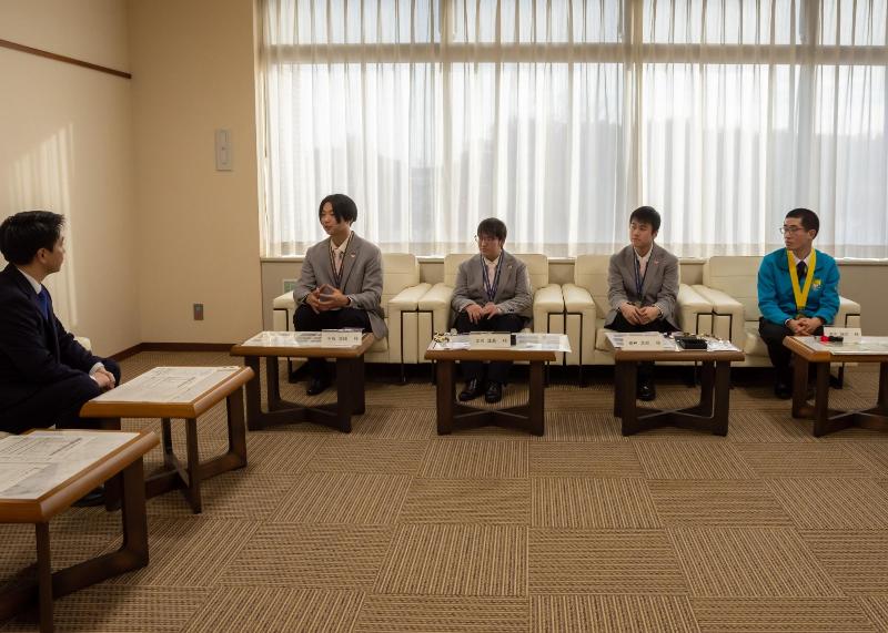 技能五輪大会は青年技能者がその技能レベルを競う大会で、青年技術者の目標となり、技能に身近に触れる機会でもあります。今回、受賞報告に訪れた出場者はいずれもトヨタ自動車株式会社の社員で、第47回技能五輪国際大会に出場した小石嵩陽(こいし・たかや)さん、北川雄基(きたがわ・ゆうき)さん、播戸蒼磨(ばんど・そうま)さん、第62回技能五輪全国大会に出場した唐牛桜河(かろうじ・おうが)さん、水野碧泉(みずの・あおい)さん、大見慶次郎(おおみ・けいじろう)さんの6人。国際大会では、小石さんが自動車板金で金メダル、北川さんと播戸さんがメカトロニクスで銀メダル、全国大会では、唐牛さんがメカトロニクスで金賞、水野さんが試作モデル製作で金賞、大見さんがプラスチック金型で銀賞を受賞しました。小石さんは国際大会での経験を「通訳を介して、現地の工具を使っての作業はなかなか難しかったです。価値観の違う人と交流できたことがよかったです」と話していました。