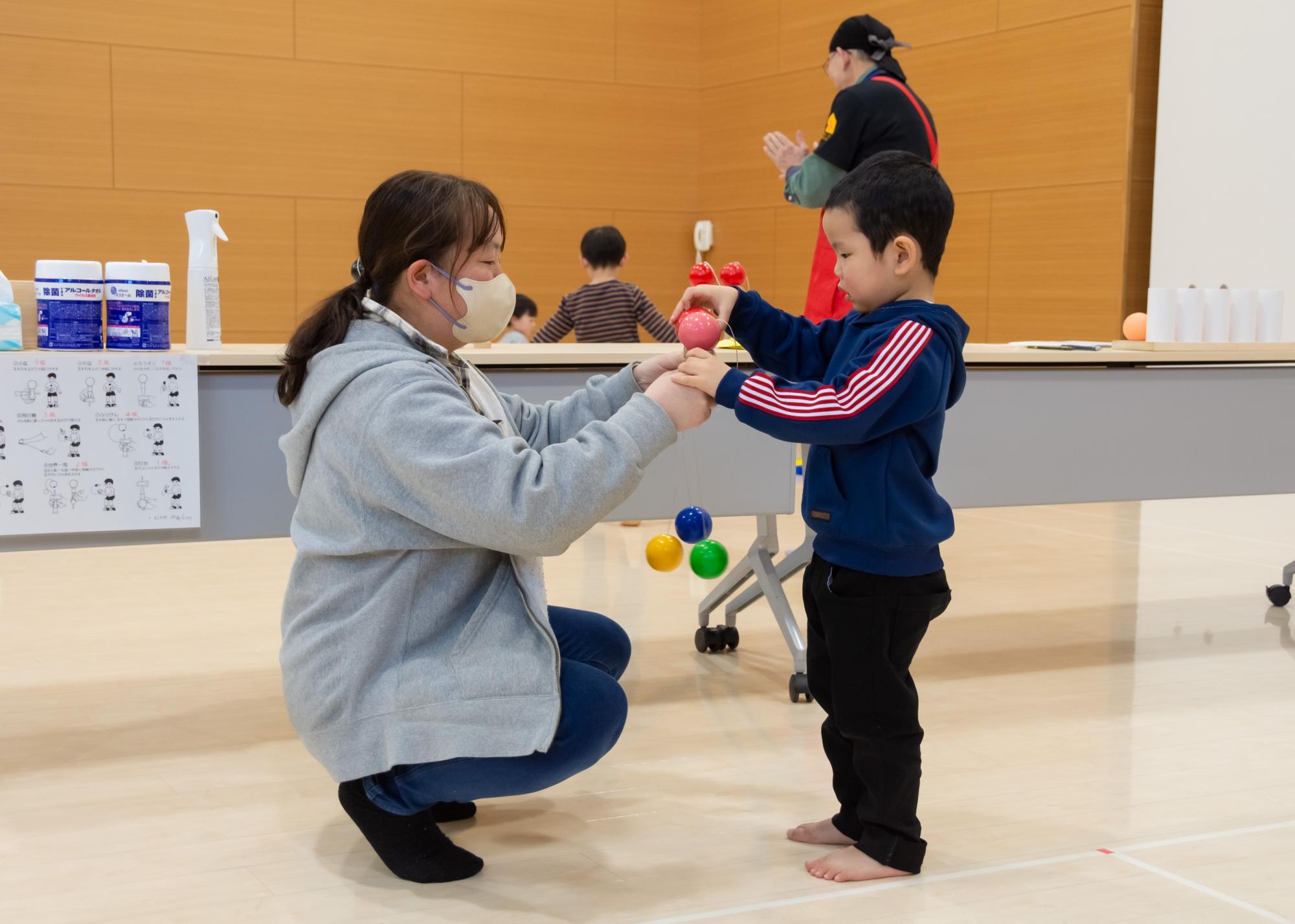 2月19日、おかよし交流センターで「出張木曽おもちゃ美術館」が開催されました。この出張美術館は、木のおもちゃに触れることで木や森との関りを大切にする豊かな心を育むことを目的に行われているものです。昨年に続き、友好都市である長野県木曽町から、木のおもちゃを中心にたくさんのおもちゃを持ってきてくれました。毎年、たくさんの家族が参加していますが、今年は日本けん玉検定協会の指導員を招いて、けん玉積み木やけん玉検定を実施。参加したみなさんはさまざまなおもちゃで遊びながら、木のぬくもりを感じていました。
