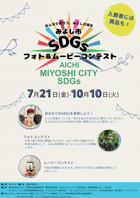 みよし市では、令和5(2023)年7月21日(金曜日)から10月10日(火曜日)までの期間中、SDGsについての意識を高め身近なものから17のゴールについて考えるきっかけをつくってもらうため、SDGsフォト&ムービーコンテストを開催します。