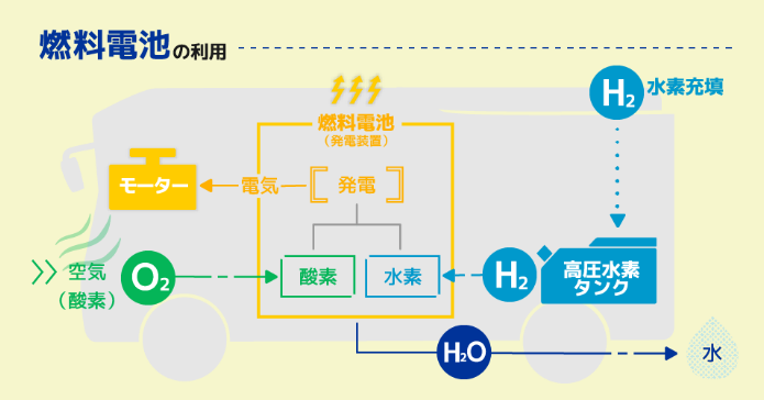 水素と酸素の化学反応で電気を生み出し、その電力でモーターを回すことによって動く仕組みになっています。