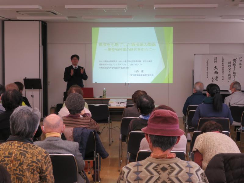 2024年1月28日、サンライブで第3回灰釉陶器コンテスト表彰式と記念講演会が開催されました。このコンテストは、市民団体「みよし猿投古窯研究会」の皆さんが、みよしが誇る焼き物づくりを子どもたちに体験してもらいたいとボランティアで小学校などに出向き、その体験授業で制作された作品などを中心に138点が出品され、市民などの投票により9つの賞が決定されました。表彰式では、会長の牧内則雄(まきうち・のりお)さんが会長賞を受賞した小学校5年の手島心(てしま・こころ)さんに賞状と記念品を贈呈しました。表彰式の終了後には、愛知県陶磁美術館学芸員の大西遼(おおにし・りょう)さんによる記念講演会が開催されました。「貴族をも魅了した猿投窯の陶器 ~黒笹90号窯の時代を中心に~」と題した講演会におよそ60人が参加し、みよしが平安時代に最も栄えた猿投窯の中心的な一大生産地であったことや、当時の都ではみよし産の陶器がとても貴重なものであったことなど、当時のみよしの技術がいかに優れていたかについて解説されると、参加者たちは驚きの声を上げるなど真剣な表情で聞き入っていました。講演会の中盤には、実際に灰釉陶器(かいゆうとうき)や緑釉陶器(りょくゆうとうき)、須恵器(すえき)に触れながら大西さんとお話しする機会も設けられ、参加者は焼き物について質問するなど楽しい時間を過ごしました。