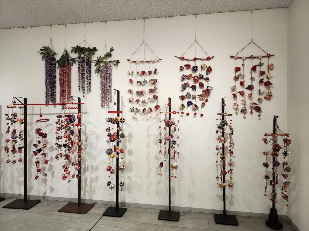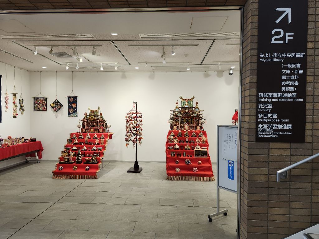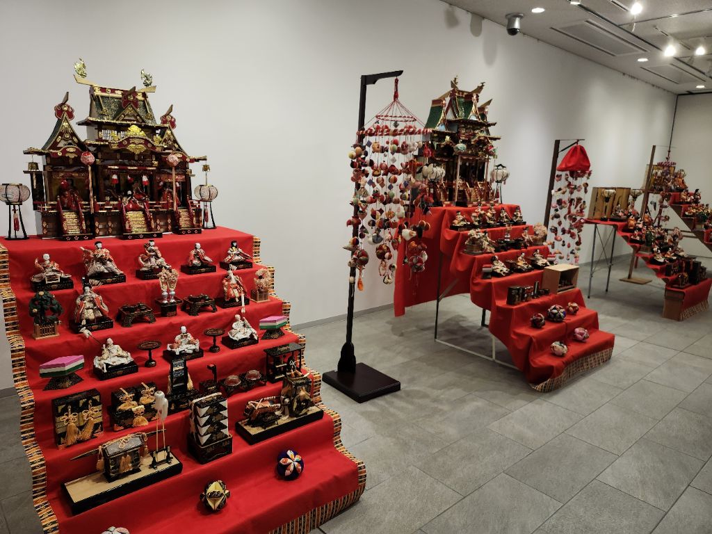 2月25日からは、図書館学習交流プラザ「サンライブ」でも関連展示として、御殿飾りや段飾りのひな人形のほかにも、手作りの「つるし雛」や「ちりめん細工のお雛様」など、様々なひな人形を展示しています。石川家住宅やカネヨシプレイスの展示と合わせて、ぜひ、ご覧ください。