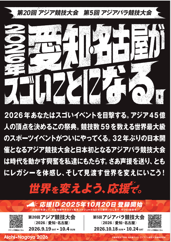 みなさん、第20回アジア競技大会(2026/愛知・名古屋)まで1年を切りました。