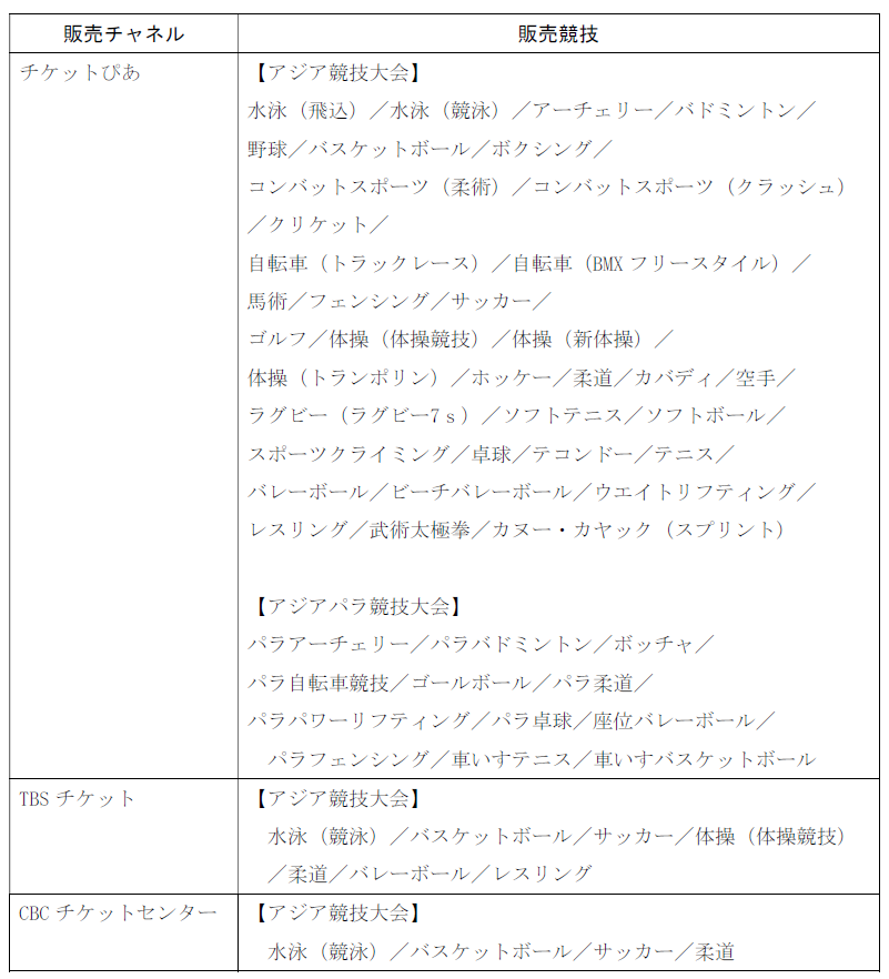 第20回アジア競技大会及び第5回アジアパラ競技大会のチケットについて、これまで組織委員会の公式チケット販売サイトで先行販売が行われていましたが、一部競技で完売となるなど、想定を上回る反響があったことを受け、新たにプレイガイドで販売されています。4年に1度開催される「アジア最大のスポーツの祭典」ぜひ現地で観戦ください!
