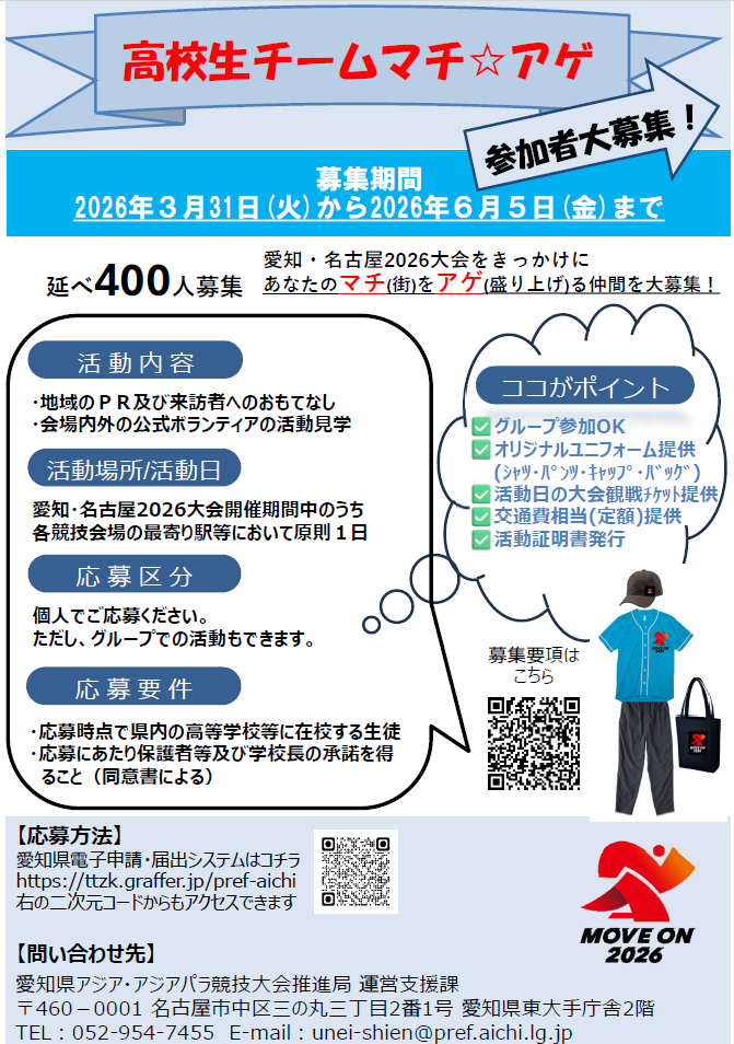 愛知県では第20回アジア競技大会・第5回アジアパラ競技大会の開催を契機に、高校生による地域の盛り上げを行うとともに、国内外から来訪する観戦客等と接することでホスピタリティやおもてなしの精神を学ぶ機会となる場を設けるため、「高校生チームマチ☆アゲ」の募集が行われています。