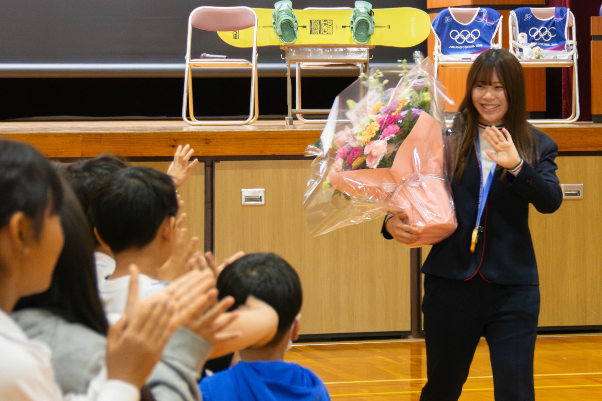 4月21日、ミラノ・コルティナ2026冬季オリンピックのスノーボード女子スロープスタイルで金メダルを獲得した、本市出身の深田茉莉(ふかだ・まり)選手を招き、母校の北部小学校でトークショーが開催されました。 深田選手が体育館に姿を現すと、集まった児童と職員が花道をつくり拍手で歓迎。続いて、紹介VTRが上映されると児童たちは大興奮。深田選手による華麗な技の数々に「かっこいい!」「すごい!」と歓声が上がりました。 トークショーでは恩師の田畑先生がインタビュアーを務め、小学校時代の思い出やオリンピックの裏話などを質問。「夢を持つことの大切さ」や「夢を実現するために必要なこと」について問われると、深田選手は「モチベーションを保ち、達成までの距離を確認するためにも、目標を持つことはとても大切。実現するためには、周りの人への感謝の気持ちを忘れないことだと思います」と語りました。さらに、今後の目標については「足りなかった部分を修正し、4年後のオリンピックで満足のいく滑りをして、再びメダルを獲得したいです」と力強く話しました。 その後、児童からの質問に答える場面もあり、トークショーを終えた深田選手は「VTR上映時の歓声や、こどもならではの質問を直接聞くことができ、とてもうれしかったです」と笑顔で話していました。