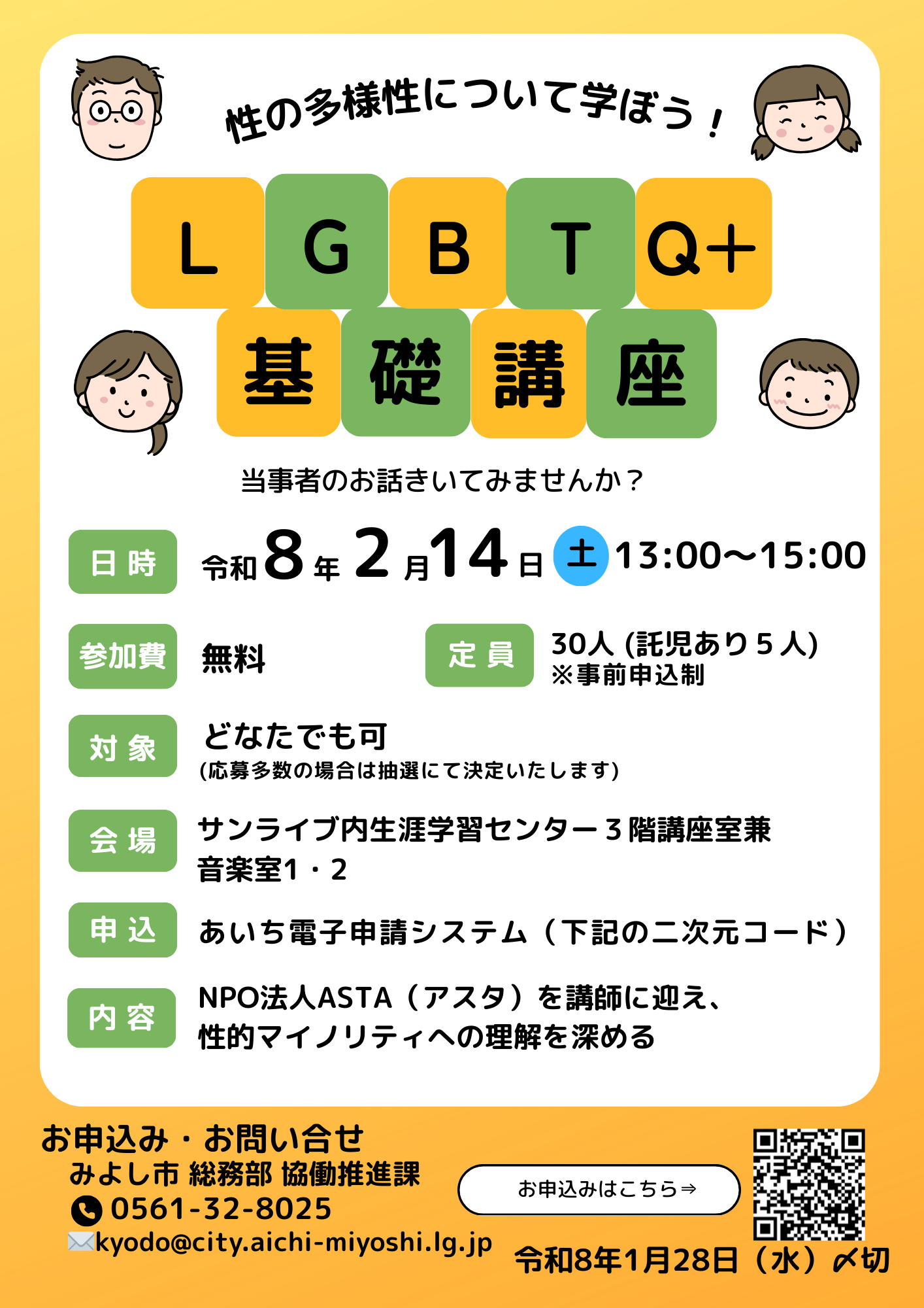 LGBTの基礎知識を学び、実際に当事者や当事者の保護者等から話を聞くことで、性の多様性についてともに考えてみませんか。