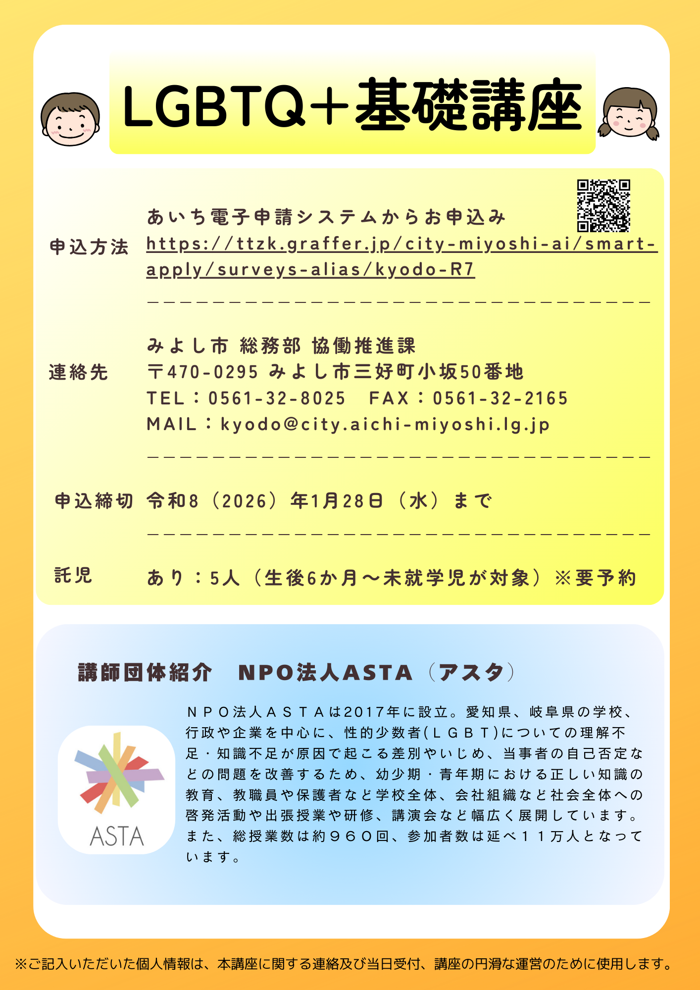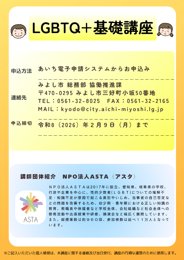 NPO法人ASTA(アスタ)を講師にお迎えし、LGBTQ+に関する基礎知識や、当事者のライフヒストリーを通して、性の多様性について理解を深めていただく内容となっています。