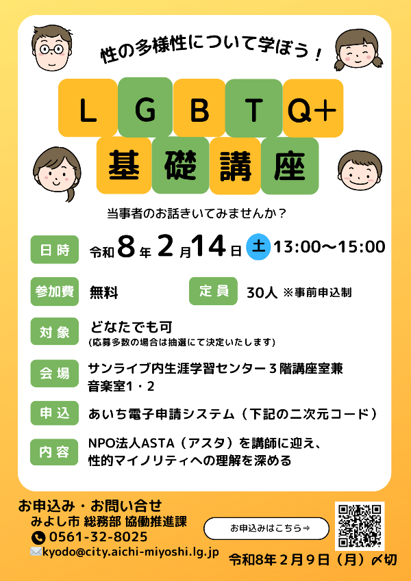 令和8(2026)年2月14日(土曜日)にサンライブ内にてLGBTQ+基礎講座を開催します。